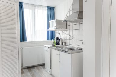 Geräumiges Studio in idealer Lage. In der Nähe des Strandes, des Zentrums und des Bahnhofs. Das Studio befindet sich in der obersten Etage des Hauses und ist mit einem bequemen Doppelbett, einer Couch, einem kleinen Essbereich und einer Küchenzeile ausgestattet. Die Küche ist mit einem Kühlschrank, einer Kombimikrowelle, einem 2-Flammen-Herd und einem Geschirrspüler ausgestattet.