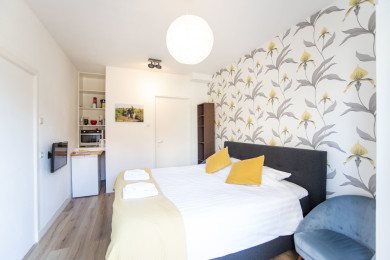 Sie betreten das Zimmer von der Terrasse aus. Im Zimmer befinden sich ein Doppelbett, ein Flachbildfernseher, ein Kühlschrank, eine Kaffeemaschine, eine Mikrowelle und ein Wasserkocher. Im Badezimmer befindet sich eine Toilette und eine Dusche.