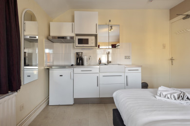 Studio 1 befindet sich im ersten Stock eines historischen Hauses, in dem Arnold Schönberg von 1920 bis 1921 lebte. Das Studio verfügt über einen Wohnbereich, einen Flatscreen-TV und eine Küchenzeile mit einem Herd, Kühlschrank, Mikrowelle und Küchenutensilien. Das gemeinsame Badezimmer mit Studio 2 befindet sich im Flur. Bettwäsche und Handtücher werden bereitgestellt. Balkon an der Vorderseit.