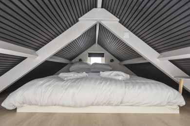 - Schlafboden unter der charakteristischen schwarzen Balkendecke mit einem Kingsize-Bett und Stimmungsbeleuchtung