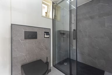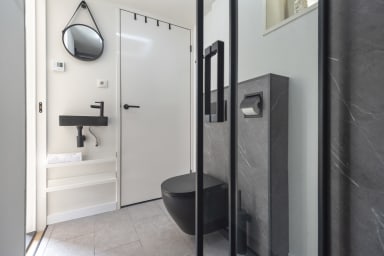 - Stilvolles Badezimmer mit Regendusche, schwarzen Sanitäranlagen und Fliesen in Marmoroptik