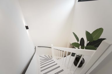 The apartment is located on the first floor, accessible via a shared hallway and staircase. Guests share the main entrance with those staying on the second floor. From the hallway, the staircase provides direct access to your private apartment.