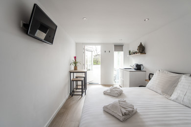 Welcome to this cozy private studio, located right next to the owner’s home. It’s the perfect base for your stay in Zandvoort. Set in a quiet neighborhood with the dunes right outside your door, and just a 10-minute walk from the beach, boulevard, and town center. The studio is comfortable and thoughtfully equipped. You'll find a double bed, a TV, a breakfast table, and a small countertop with coffee and tea facilities. The modern bathroom includes a walk-in shower and toilet. At the front, there’s a sunny terrace where you can relax. Free parking is available on the driveway or in the street.