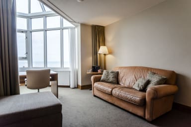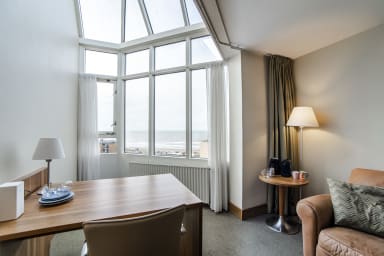 In the suite there is also a comfortable sofa, a desk and the possibility of making coffee and tea. The glass bay window provides extra light and a view of the beach and the sea.