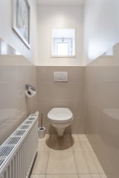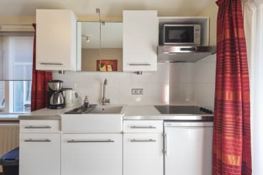 Studio 2 is on the first floor of a historic house where Arnold Schönberg lived in 1920-1921. The studio includes a seating area, flat-screen TV, and a kitchenette with a stove, fridge, microwave, and kitchenware. The shared bathroom with Studio 1 is in the hallway. Bed linen and towels are provided. The balcony at the back of the house has a seating.