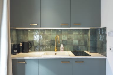 - Single-burner induction stove, combi microwave/oven, and mini fridge