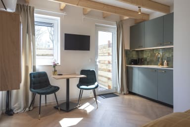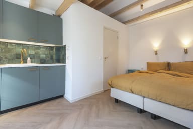 Charming and stylish guesthouse "De Beuk", located in the peaceful, wooded area of Aerdenhout. Close to the beaches of Zandvoort and Bloemendaal, and just a short distance from Haarlem and Heemstede. The perfect base for a relaxing holiday in nature with all the comforts of home. Ideal for a romantic getaway or a remote work stay. Your accommodation offers a private entrance, a cozy private garden (15 m²), and complete privacy. Inside, you’ll find a bright living/sleeping area with a compact luxury open kitchen, fully equipped with everything you need. Enjoy the peace, comfort, and the beautiful green surroundings. Free private parking is available on site.