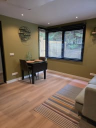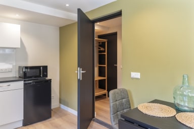 This modern, fully ground-floor apartment offers you a charming and comfortable stay and overlooks a beautiful terrace surrounded by greenery. Upon entering through the hall, you will find the living room with open-plan kitchen, a dining area and a modern sofa. At the back of the apartment you will find the double bedroom with ensuite bed. The bathroom has a shower cubicle, sink and toilet. For extra comfort, the studio has a spacious private terrace among the greenery, contributing to a relaxed and pleasant atmosphere. An ideal retreat for those looking for peace, comfort and convenience.