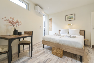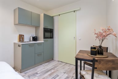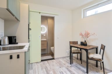 Studio Elysium is a brand-new, impeccably kept and comfortable studio for two, just a 5-minute stroll from both the village centre and the beach. Inside you’ll find a generous double bed and a handy kitchenette (no hob) with a combination microwave oven and fridge, plus a cosy dining nook. A spacious, on-trend bathroom completes the space. Outside, the private terrace is perfect for unwinding after a day at the beach or a night out. Parking is stress-free: you can park your car right next to the accommodation on our private grounds, and you can safely store your bikes on the terrace.