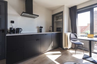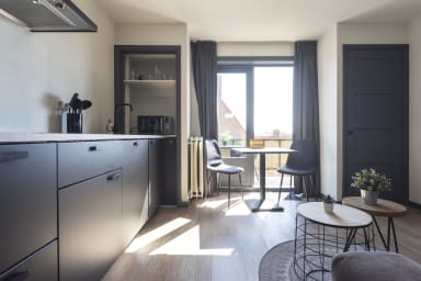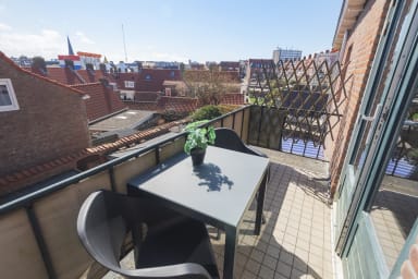 De leefruimte beschikt over een gezellige zithoek met televisie en staat in open verbinding met de volledig ingerichte keuken. Of u nu zelf een eenvoudig ontbijt maakt of uitgebreider wilt koken, alles is aanwezig voor een zorgeloos verblijf. De kleine maar knusse slaapkamer is voorzien van een comfortabel tweepersoonsbed van 1.60 m x 2.00 m. De luxe badkamer beschikt over een bad, wastafel en toilet. Daarnaast heeft het appartement een privébalkon, een fijne extra plek om buiten te zitten en te genieten van de frisse zeelucht. Een sfeervolle en praktische uitvalsbasis op korte afstand van het strand en het centrum.