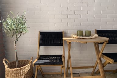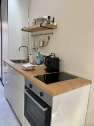 Via de charmante patio betreedt u de studio. Deze stijlvolle studio beschikt over een volledig uitgeruste keuken om een kleine maaltijd te bereiden en een uitklapbaar eettafeltje. Op de patio kunt u heerlijk genieten van warme zomeravonden.