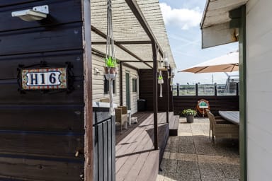 Privé cahlet aan de overkant van het strand met een groot terras en parkeerplaats. Voor 2 volwassenen en 2 kinderen.