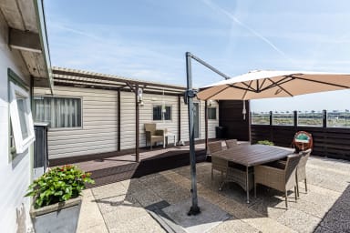 Gezellig ingericht chalet met 2 slaapkamers met een, badkamer, zit- en eethoek en een groot overdekt terras, perfecte warme zomeravond.