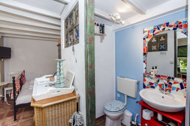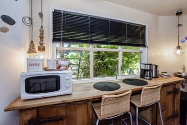 Deze gezellige studio is klein maar zeer knus en daardoor perfect voor twee personen. Je komt binnen via de sfeervolle patio. Zodra je de louvredeuren opent, stap je een lichte ruimte binnen met een comfortabel tweepersoonsbed, een kleine eettafel en een hoek om een eenvoudig ontbijt te bereiden – met uitzicht op de gedeelde patio. De studio beschikt over een eigen badkamer met douche en toilet.